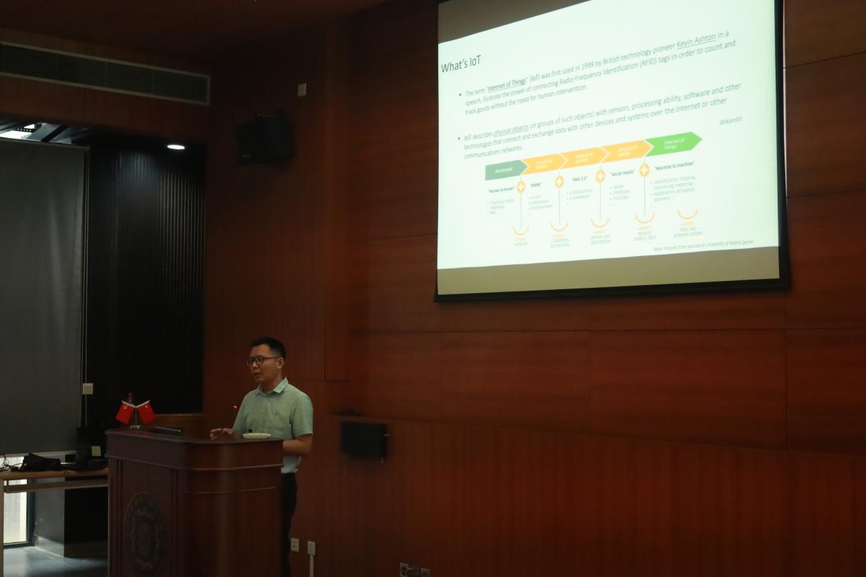 接下来,由易星博士带来讲座。易星博士主要从Introduction of IoT和Application of IoT两部分进行介绍。首先易星博士从物联网的起源、定义展开进行介绍。物联网是一种通过连接设备、传感器和网络,使它们能够相互交流和共享数据的技术。它的出现使得各种设备和系统能够实现实时数据传输和交互,从而在许多领域带来了巨大的变革。易星博士从消费层面与工业层面阐述了物联网的作用。在消费层面,物联网有着实时获得信息、有助于健康数据的监控、提高个人生活质量等优点。在工业层面,物联网可以提高生产的效率,预防生产中断以及节约能源的优点。