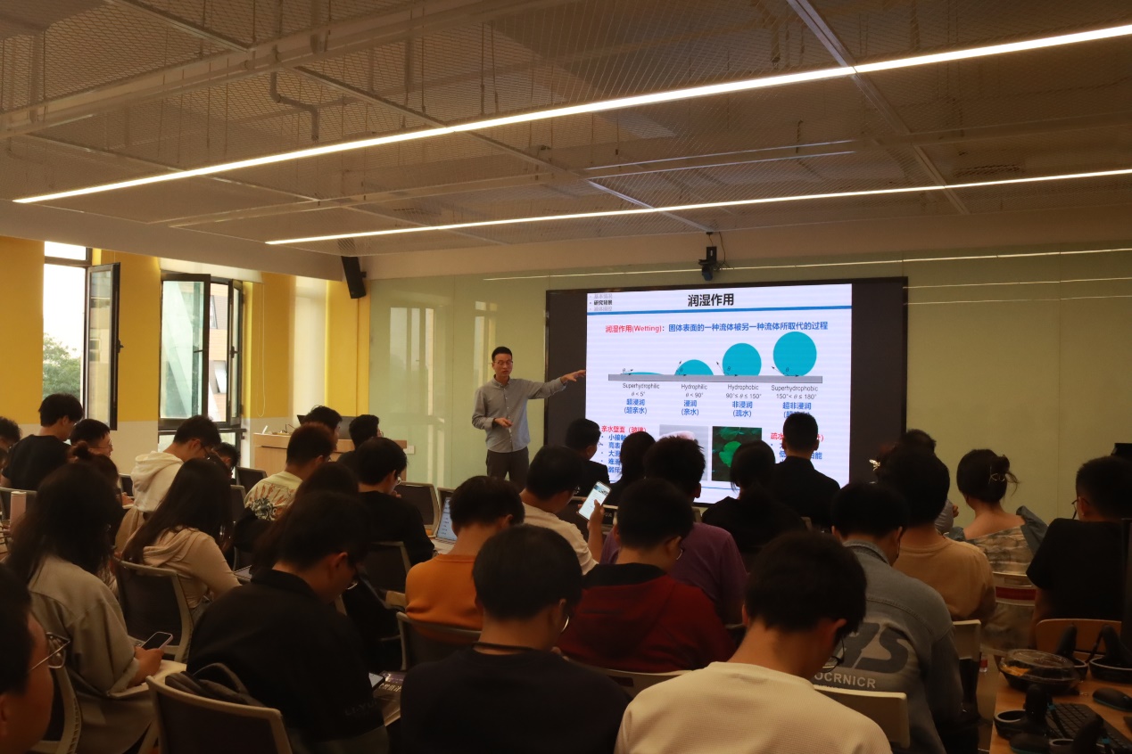 和京都大学获得学士、硕士和博士学位,博士导师为Ryoichi Kurose教授和Mitsuhiro Matsumoto教授,2021年进入东京大学Junichiro Shiomi教授课题组从事博士后研究,之后在华为2012实验室-海光产品部从事高端精密设备的研发工作。主要研究方向为多尺度动态润湿、微流控、多相流固耦合数值计算、气液界面传质传热、两相流致振动等。本次论坛中袁志成博士的报告主题为“壁面润湿特性对液体行为的操控机制”。“出淤泥而不染,濯清涟而不妖”- 周敦颐的《爱莲说》中的这句诗,以莲的洁净和高雅比喻人的品格和行为。而实际上,这种自然现象也蕴含着深深的科学原理。雨水在荷叶表面自由滑动的现象,以及雨水在玻璃表面难以滑动的情况,都与固体表面的润湿特性有着密切的关系。袁志成博士以此为切入点,告诉同学们润湿是液体与固体表面之间相互作用的现象,这个现象会影响到液体的行为,比如在固体表面的附着、滚动、渗透等。固体表面的润湿特性对液体的行为具有调控作用,这为解决工业难题提供了新的思路。通过对表面润湿特性的研究,人们可以了解液体在不同固体表面上的行为特征,从而进行人为设计,特定地操控液体的行为。比如,改变固体表面的润湿特性,可以调控液体的附着、流动和扩散等行为,从而实现工业生产中的液体控制和分离等操作。对于流体机械、热能工程、力学等专业的学生来说,了解和研究固体表面的润湿特性具有重要的意义,这不仅有助于他们理解液体的行为和运动规律,也能为他们未来的学习和工作提供实用的知识和技能。