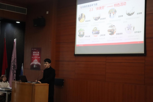 本次活动分两部分进行。第一部分班级管理经验交流及小组讨论在开物馆A101报告厅举行。首先是优秀班级建设案例的经验分享。本科生2018级机械二班班长郑光泽从德智体美劳五个维度切入介绍了班级特色活动和班级的建设情况;研究生2018级机械设计硕士班班长曾健宾重点介绍了实施活动轮流制、合理进行班委分工、关注同学们的需求等班级管理的建议;研究生2018级暖通燃气硕士班班长李嘉劼以本班级为例,剖析了研究生班级的特点、以及研究生班级干部应承担的职责和应发挥的作用;研究生2019级工业工程硕士班班长易琦则展开介绍了班级的学风建设与特色活动,以及班级管理建设的方法思路。