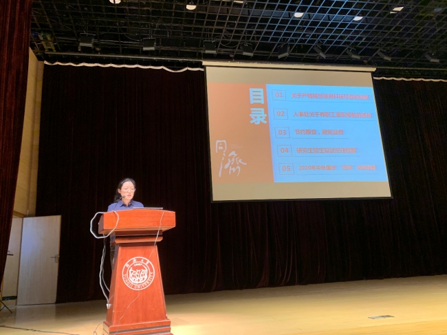 9月29日下午13:30,我院2020年秋季全院教职工大会在济人楼101报告厅召开,学院党委书记宋木生,院长卞永明,党委副书记于颖、高玉磊,副院长訚耀保、李峥嵘、高乃平、汤奇荣等学院领导以及150余位教职工参加了会议。