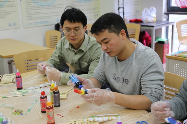 第二部分是下午举行的扎染传统文化体验活动。活动邀请到罗玫瑰老师为大家进行了扎染相关知识的科普,她介绍了扎染的历史渊源及制作扎染的技艺方法,并指导大家采用不同的扎布方法并对布料进行沾染浸润。师生们认真动手进行了实践,收获了一个个独具匠心、绚烂多彩染布,同时也深深感受到了这项流传千年的传统民间工艺魅力,感受到了背后蕴藏的中华民族深厚的文化底蕴。