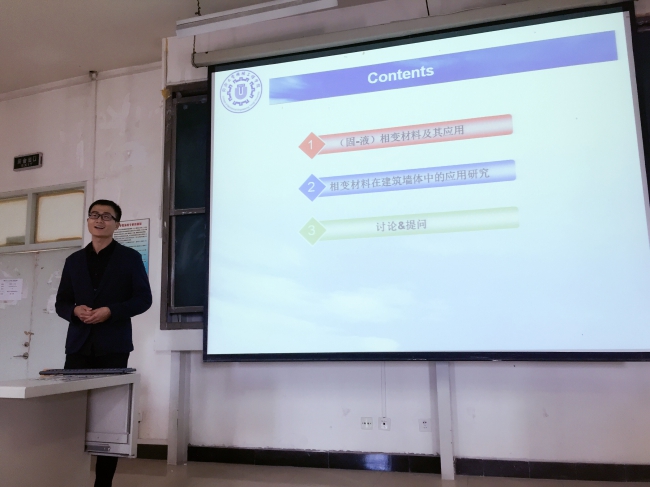 下午,郭朝斌和王旭为建工学院的师生带来了学术交流讲座。郭朝斌博士以《压缩空气地下含水层储能系统设计及可行性分析》为题,从研究背景、系统设计、可行性分析、影响因素等方面介绍了自己的研究成果,并谈了自己在美国劳伦斯伯克利国家实验室的交流经历和收获。王旭本科毕业于新疆大学建工学院,此次回到母校,向老师和同学们汇报了自己在“相变储能在建筑墙体中的应用研究”方面的研究成果,并结合自身经历一一解答了学弟学妹们在学习和未来发展方面的疑问与困惑。