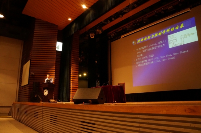 张明先生演讲结束后,机械能源工程学院訚耀保教授呈现了第二场精彩的演讲。訚教授以航空航天舰船等重大工程为载体,生动形象地展示了液压与气动的起源,阐释了液压与气动理论,诠释了流体转动与控制的相关知识,并介绍了极限环境下的流体控制问题。演讲中,訚教授列出了大量数据展示我国科学技术发展近况,让同学们在数据中真切地体会到青年一代肩负重大历史责任,并要为建设更好未来而倾尽全力。