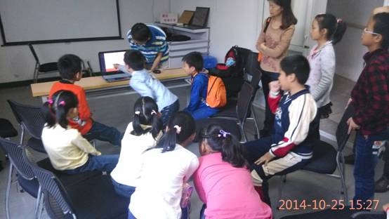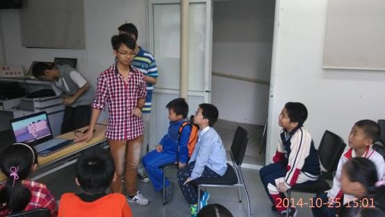 随后是刘振辉同学们的展示。他先向大家介绍了日本灵活的本田ASIMO智能机器人,播放机器人行走,倒水等动作的视频,机器人憨态可掬的造型吸引了小朋友们的注意力。他还着重介绍我们学院自己设计的循迹机器人,通过播放机器人循迹的整个过程,向大家讲解机器人的设计构想,行走规律,以通俗易懂的方式,让大家既能听懂,还能对此产生兴趣。