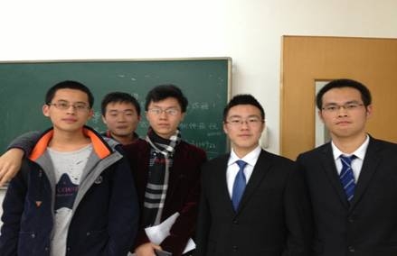 赛后合影,从左到右分别为:学术部领队孙艺勇,一辩谭添,二辩倪孝慈,四辩刘一鹏,三辩陈威铭