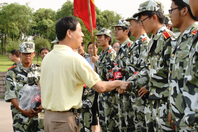 校领导与军训学生一一握手,了解他们的训练成果,并鼓励学子们继续发扬吃苦耐劳的精神、锻炼体魄、磨练意志、为人民服务!学校向训练学生赠送了大瓶可乐和中秋月饼。我院也为在炎炎夏日为学生们准备了清凉饮品,于航书记亲切询问了同学们的军训感受,肯定了同学们几天来取得的成绩,希望同学们以最好的姿态迎接即将到来的阅兵式,展现机械学子的精神风貌,并且提醒同学们别忘记中秋节给父母打个电话,送上祝福与感恩。随后,于航老师也向带训教官和随训教师送上慰问品,以表达对教官和老师们付出的感谢!