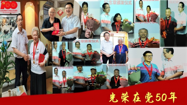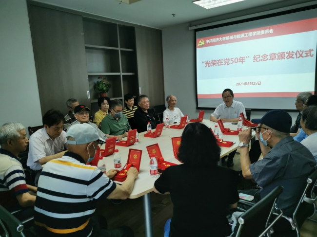 党委“光荣在党50年”纪念章颁发仪式在四平路校区衷和楼602会议室隆重举行。学院党委书记宋木生、“光荣在党50年”纪念章获得者代表、退休党支部书记及支委、在职教工支部书记以及组织员等近20人参加了纪念章颁发仪式。