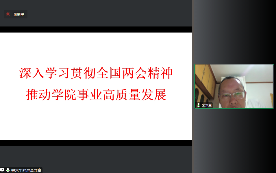 党委书记宋木生老师领学2023年全国两会精神,依次学习两会中的政府工作报告、立法法修正案、人大常委工作报告、政协常委工作报告、最高人民法院工作报告、最高人民检察院工作报告、国务院机构改革方和选举决定情况,两会期间习近平总书记关于教育科技人才工作的重要讲话,以及政府工作报告中有关教育科技人才工作的内容。
