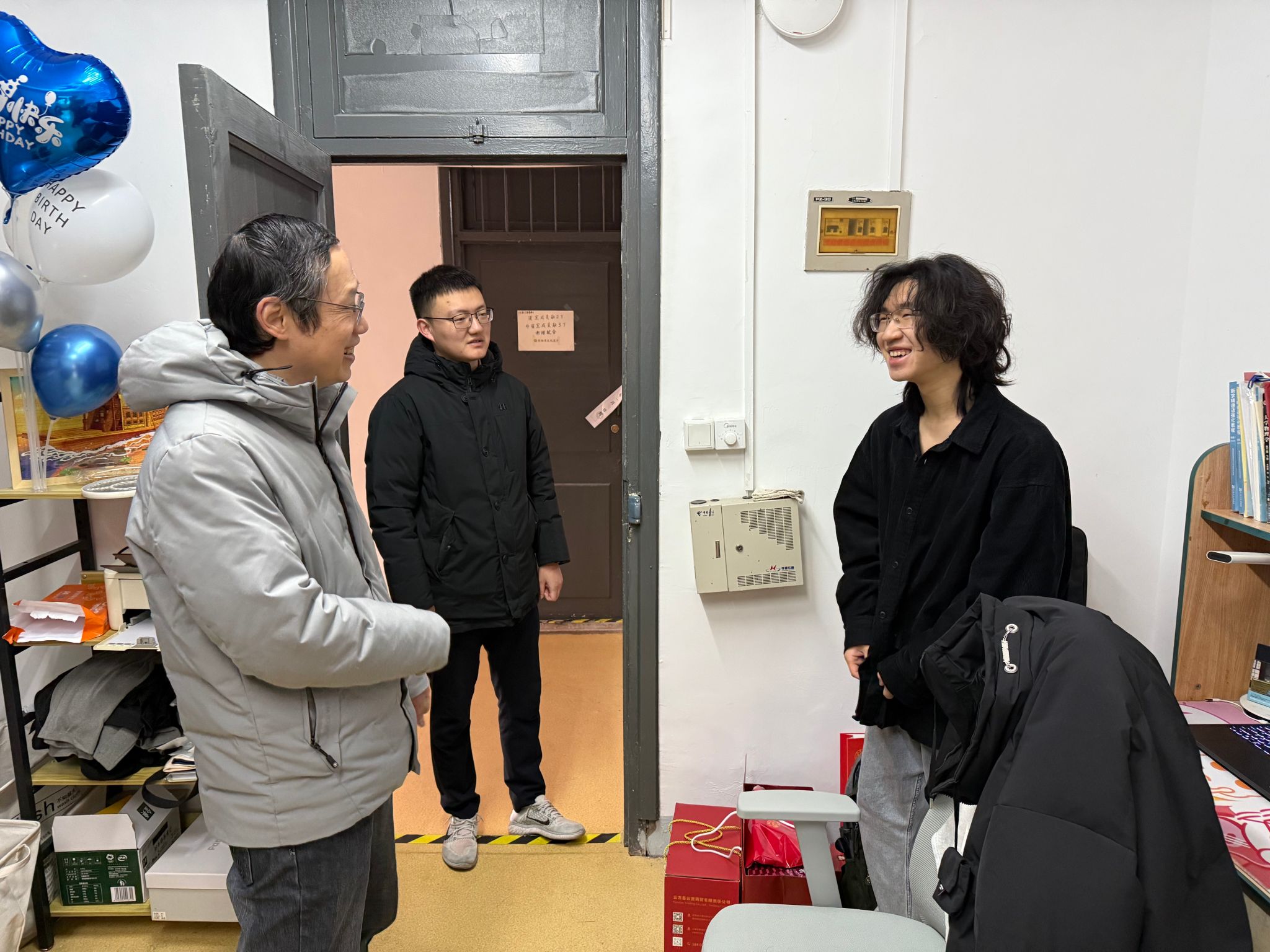 走访过程中,老师们与同学们亲切交谈,细致了解同学们学习生活情况,留校原因及生活需求等。宋木生老师亲切关怀每一位学生:了解家庭情况,是否有无生活、学习困难;叮嘱同学们寒假期间注意用电安全;保持与家人、朋友的联系,让家人放心。郑彧豪老师提醒同学们寒假期间合理安排学习与休息,注意劳逸结合;遇到任何问题随时与辅导员联系沟通。最后,为同学们送上新春祝福和新年大礼包。