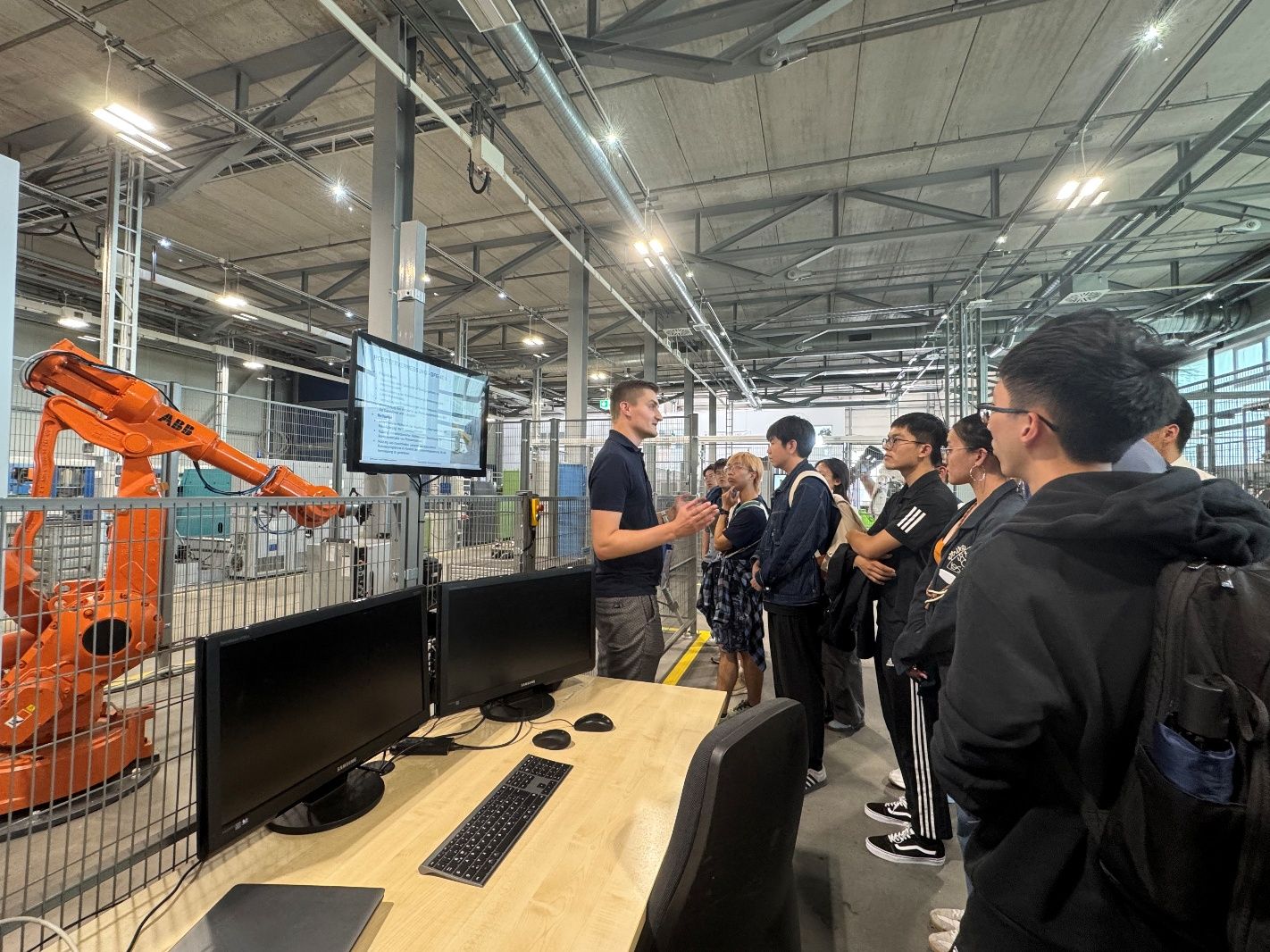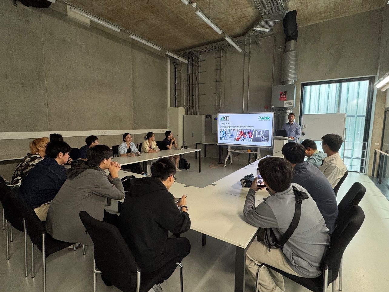 wbk生产科学研究所组织团队成员参观卡尔斯鲁厄研究工厂(Karlsruher Forschungsfabrik),讲解“机器人与生产工艺导论”,介绍了工业4.0、机器人化智能制造、自动化、3D打印、材料测试等相关领域设备与技术应用。