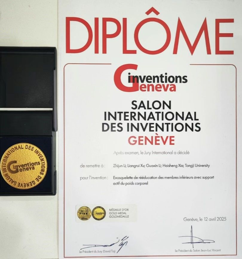 On 13th April 2025, at the 50 th International Exhibition of Inventions of Geneva, the Rehabilitation Lower-limb Exoskeleton with Active Following Body Weight Support and the Light Wing vision large model wearable glasses, which were independently researched and developed by the team of Prof. Zhijun Li’s team (dean of School of Mechanical Engineering Tongji University), were awarded the Gold Award and the Silver Award respectively, in a strong breakthrough among the 2,000 state-of-the-art inventions from nearly 40 countries and regions in the world. Among them, the Rehabilitation Lower-limb Exoskeleton with Active Following Body Weight Support won the ‘Special Invention Award’ (only 1% of the awards) for its breakthrough technological innovation.